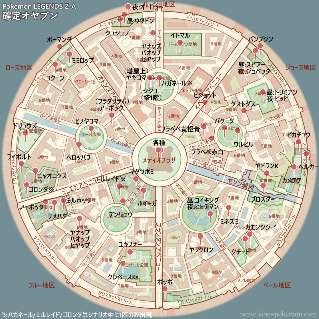 エリアごとの決まった出没点に確定出現するオヤブン一覧。これらのポケモンは出現したときは必ずオヤブンとして出現する。ただし、時間帯 (昼/夜) などの出現条件がある場合もある。また、同じ出没点に他の出現候補がいる場合は、ランダムでいずれか1匹が出現する。オヤブンは倒したり捕まえても一定時間 (1~5分) 経つと復活する。