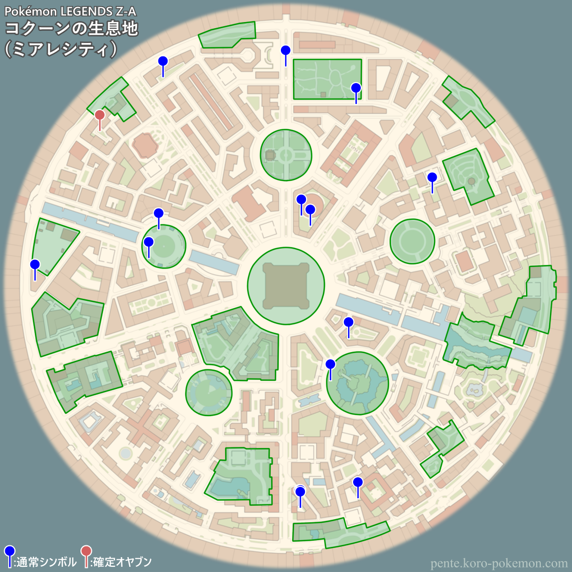 『Pokémon LEGENDS Z-A』(ポケモンレジェンズZ-A/ポケモンZA) の冒険の舞台ミアレシティにおけるコクーンの生息地/分布図。