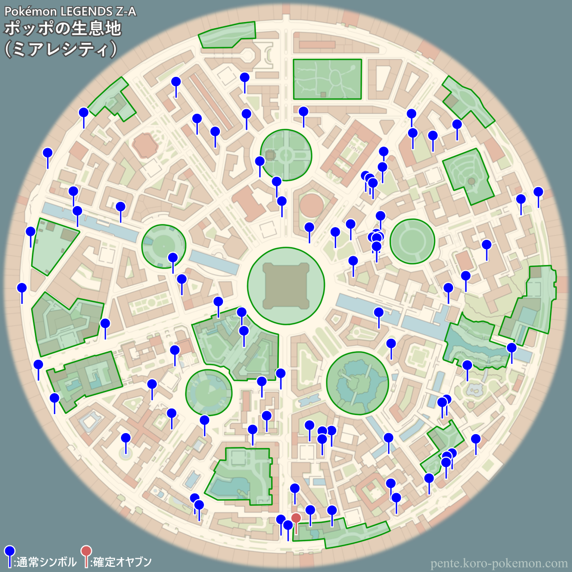 『Pokémon LEGENDS Z-A』(ポケモンレジェンズZ-A/ポケモンZA) の冒険の舞台ミアレシティにおけるポッポの生息地/分布図。