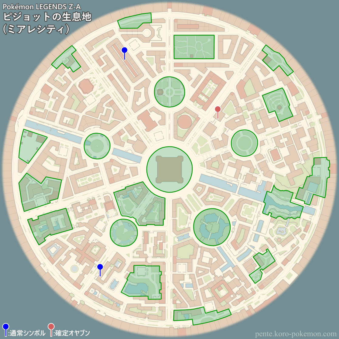 『Pokémon LEGENDS Z-A』(ポケモンレジェンズZ-A/ポケモンZA) の冒険の舞台ミアレシティにおけるピジョットの生息地/分布図。