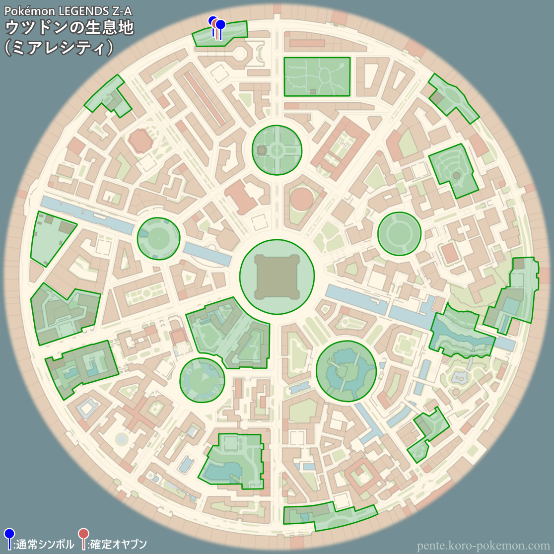 『Pokémon LEGENDS Z-A』(ポケモンレジェンズZ-A/ポケモンZA) の冒険の舞台ミアレシティにおけるウツドンの生息地/分布図。