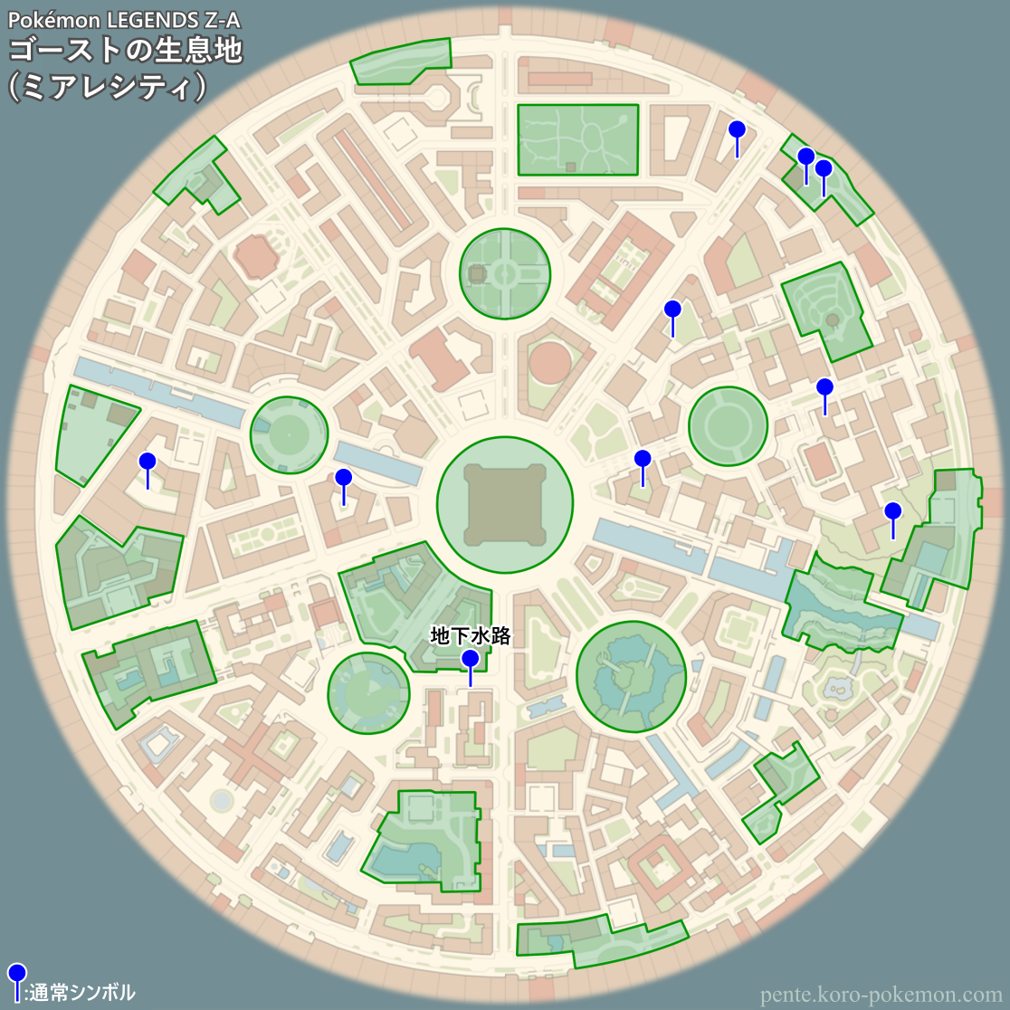 『Pokémon LEGENDS Z-A』(ポケモンレジェンズZ-A/ポケモンZA) の冒険の舞台ミアレシティにおけるゴーストの生息地/分布図。
