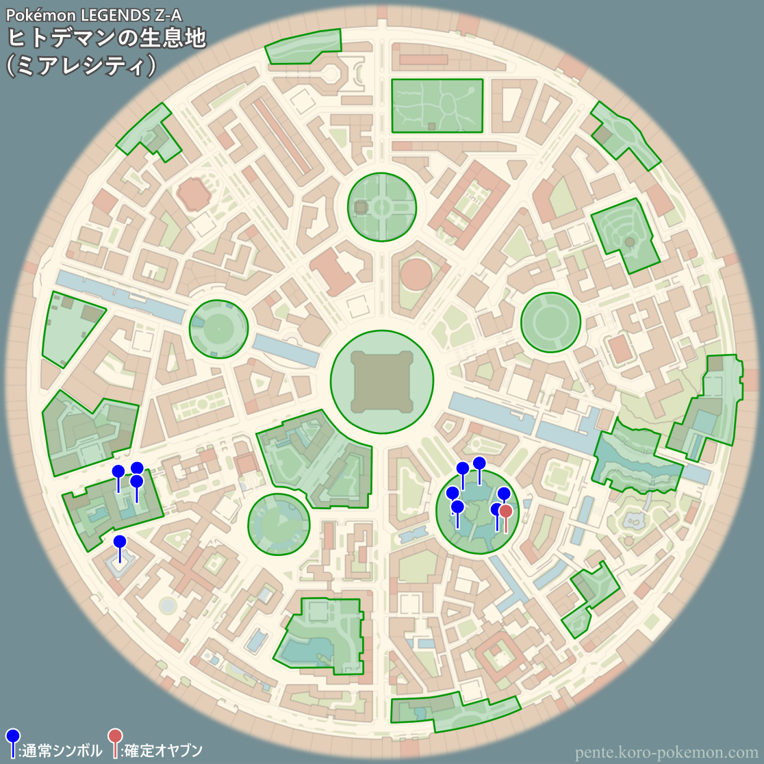 『Pokémon LEGENDS Z-A』(ポケモンレジェンズZ-A/ポケモンZA) の冒険の舞台ミアレシティにおけるヒトデマンの生息地/分布図。