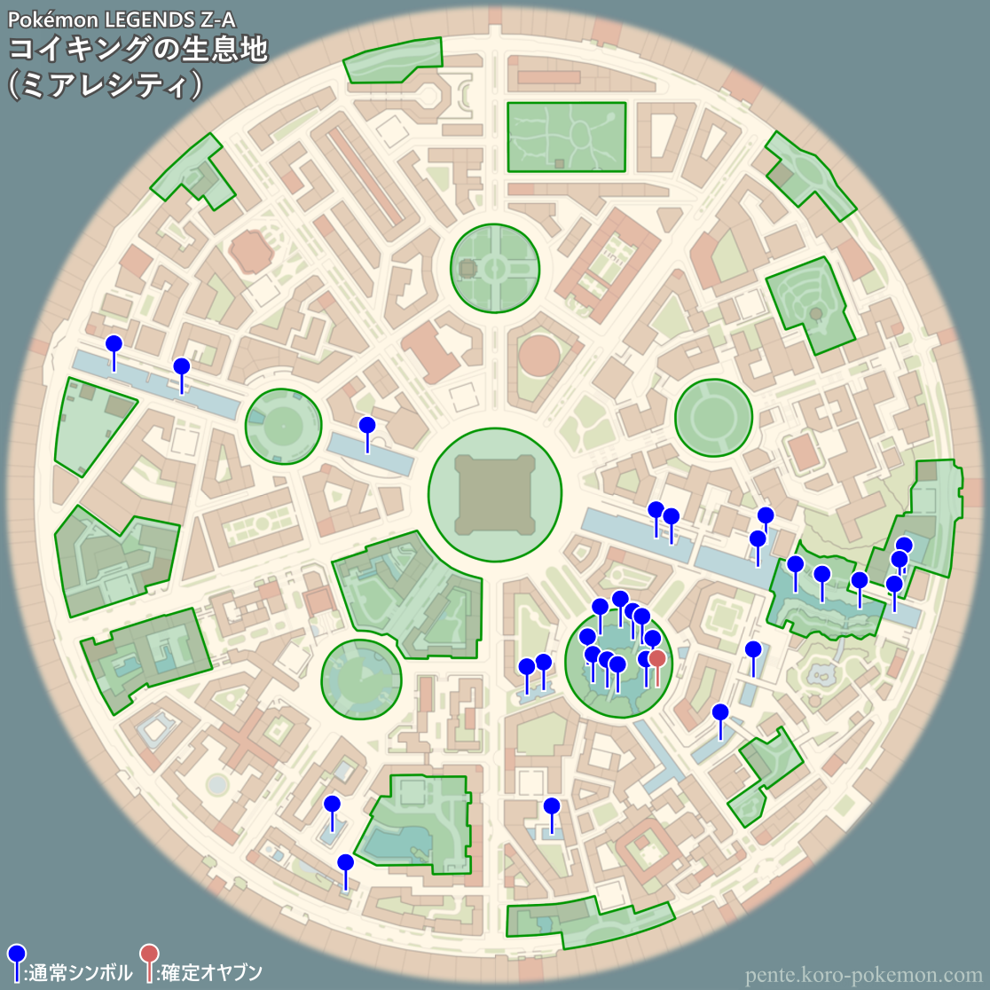 『Pokémon LEGENDS Z-A』(ポケモンレジェンズZ-A/ポケモンZA) の冒険の舞台ミアレシティにおけるコイキングの生息地/分布図。