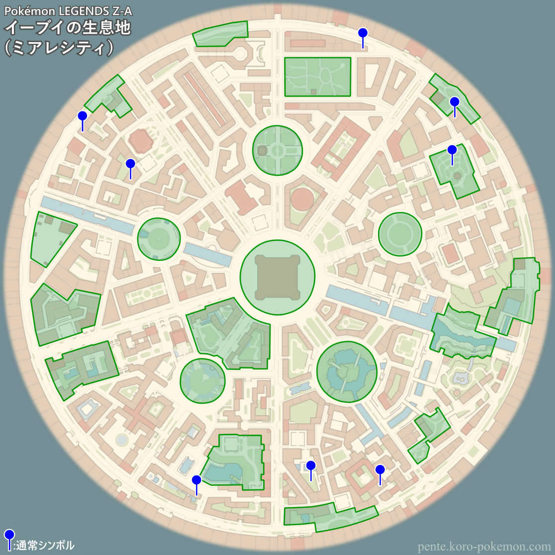 『Pokémon LEGENDS Z-A』(ポケモンレジェンズZ-A/ポケモンZA) の冒険の舞台ミアレシティにおけるイーブイの生息地/分布図。