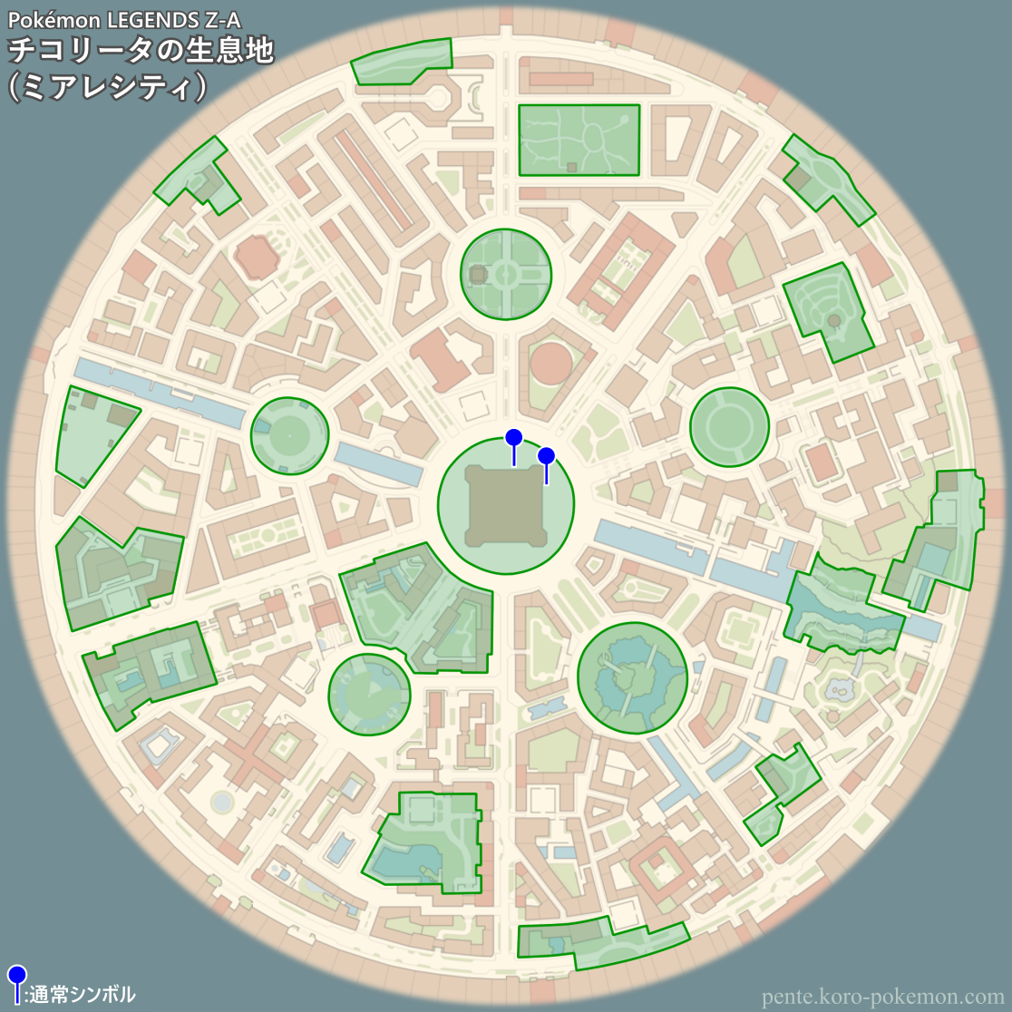 『Pokémon LEGENDS Z-A』(ポケモンレジェンズZ-A/ポケモンZA) の冒険の舞台ミアレシティにおけるチコリータの生息地/分布図。