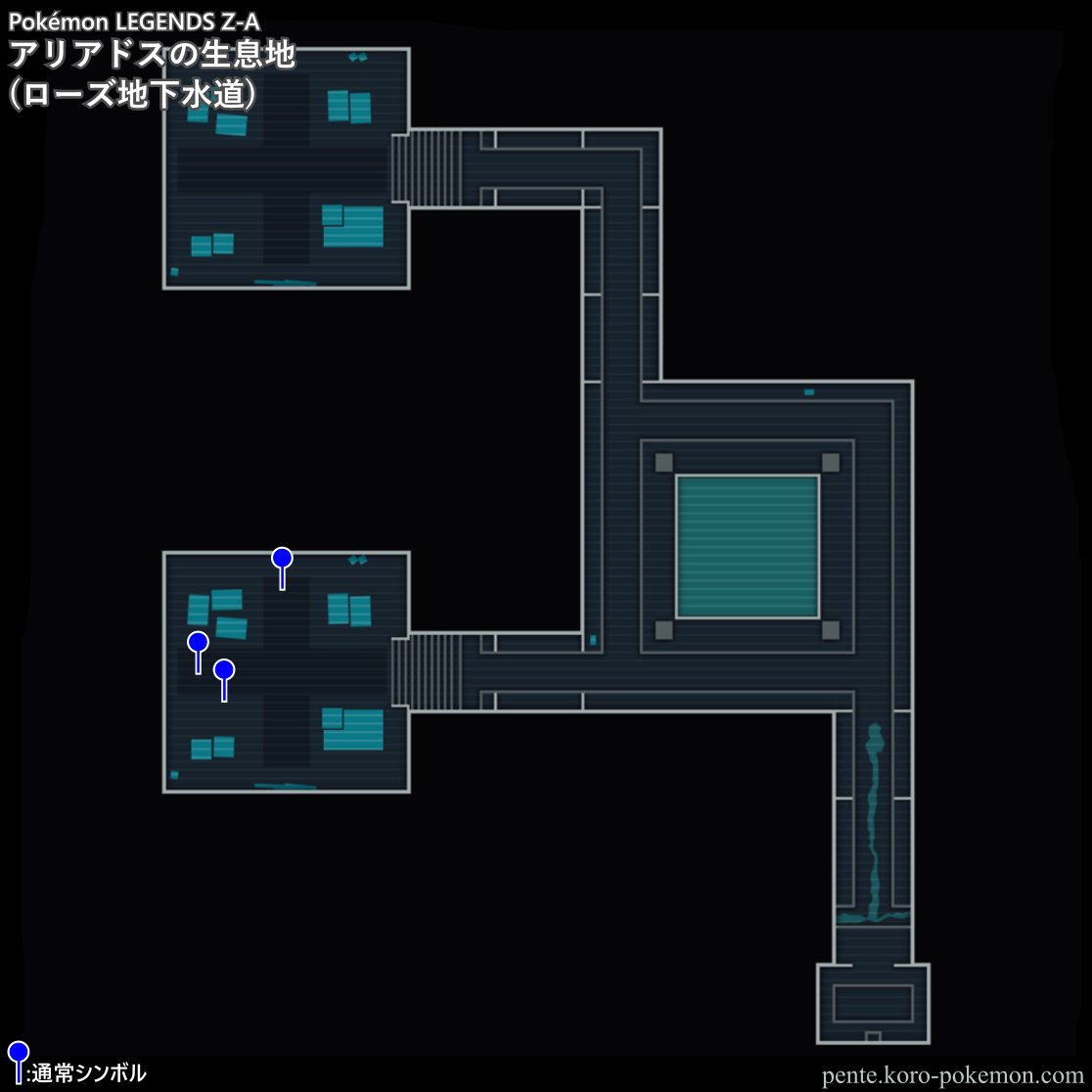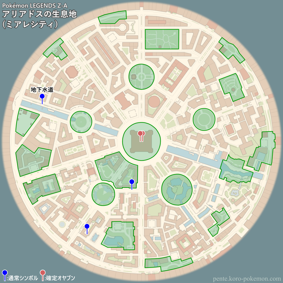 『Pokémon LEGENDS Z-A』(ポケモンレジェンズZ-A/ポケモンZA) の冒険の舞台ミアレシティにおけるアリアドスの生息地/分布図。