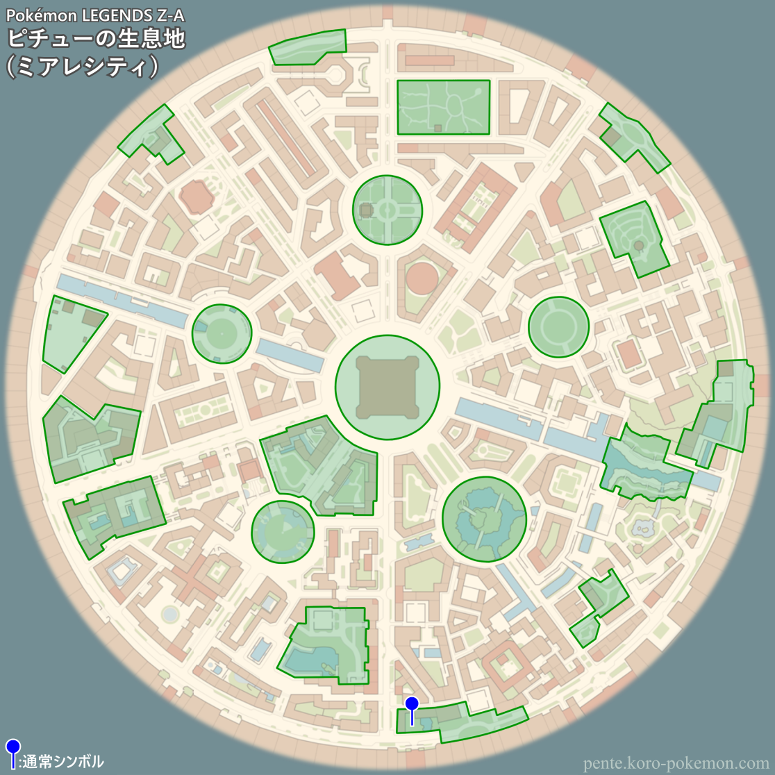 『Pokémon LEGENDS Z-A』(ポケモンレジェンズZ-A/ポケモンZA) の冒険の舞台ミアレシティにおけるピチューの生息地/分布図。