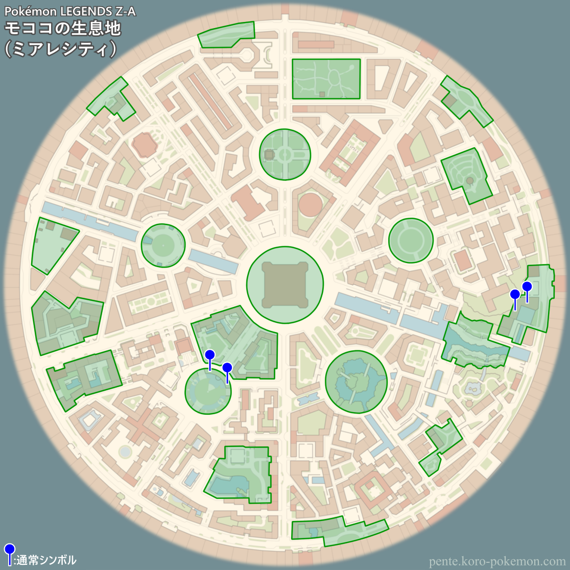 『Pokémon LEGENDS Z-A』(ポケモンレジェンズZ-A/ポケモンZA) の冒険の舞台ミアレシティにおけるモココの生息地/分布図。