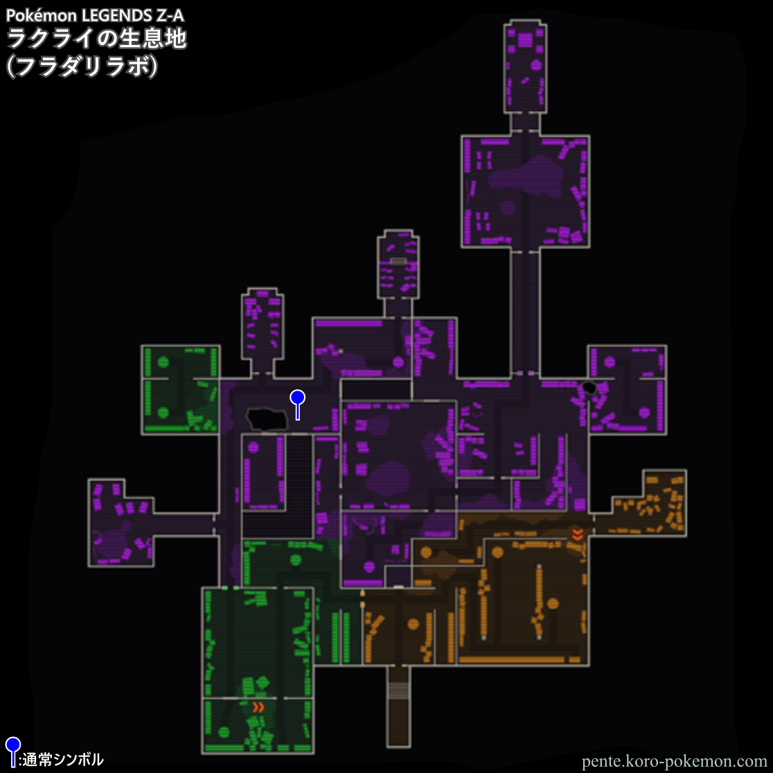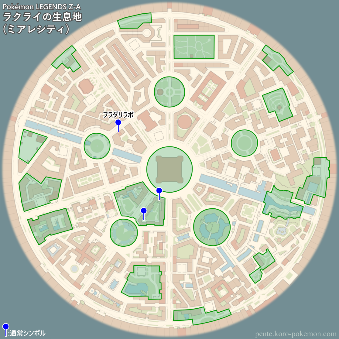 『Pokémon LEGENDS Z-A』(ポケモンレジェンズZ-A/ポケモンZA) の冒険の舞台ミアレシティにおけるラクライの生息地/分布図。