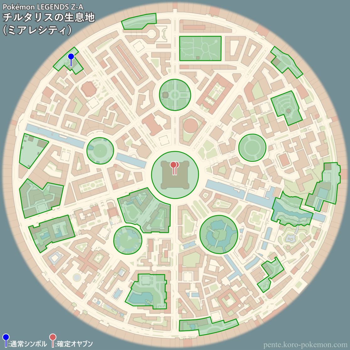 『Pokémon LEGENDS Z-A』(ポケモンレジェンズZ-A/ポケモンZA) の冒険の舞台ミアレシティにおけるチルタリスの生息地/分布図。