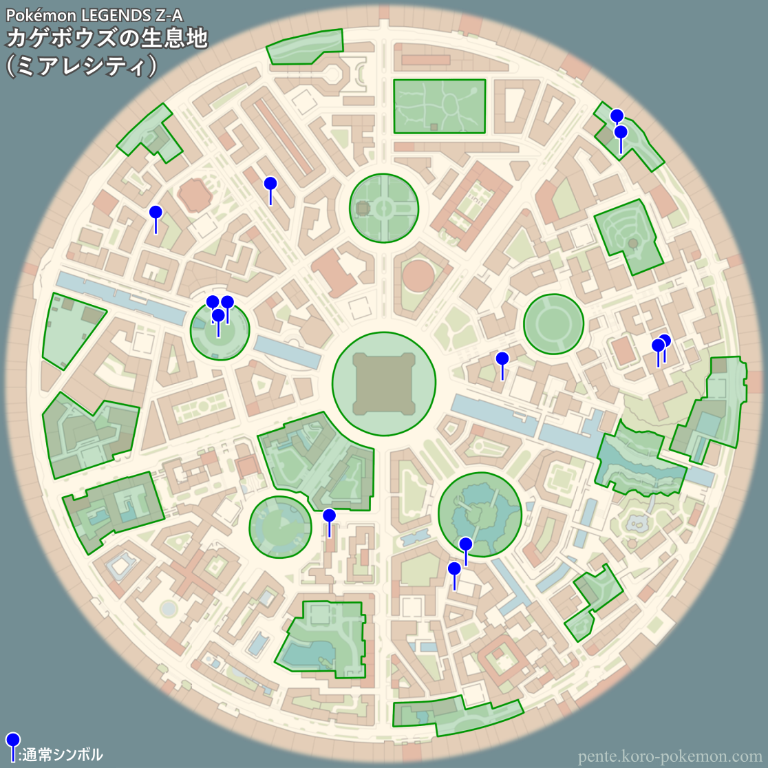『Pokémon LEGENDS Z-A』(ポケモンレジェンズZ-A/ポケモンZA) の冒険の舞台ミアレシティにおけるカゲボウズの生息地/分布図。