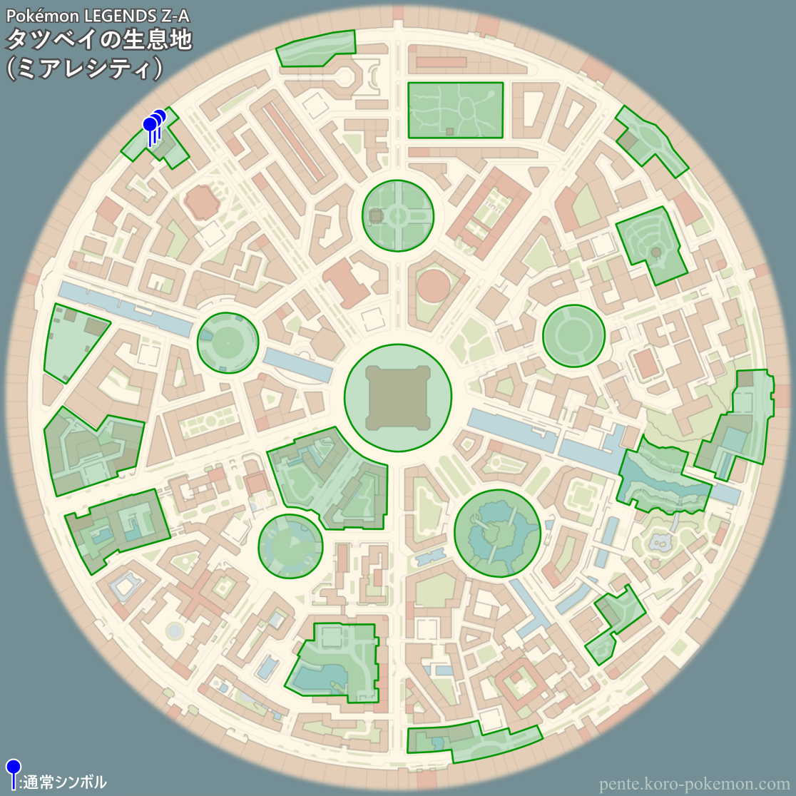 『Pokémon LEGENDS Z-A』(ポケモンレジェンズZ-A/ポケモンZA) の冒険の舞台ミアレシティにおけるタツベイの生息地/分布図。