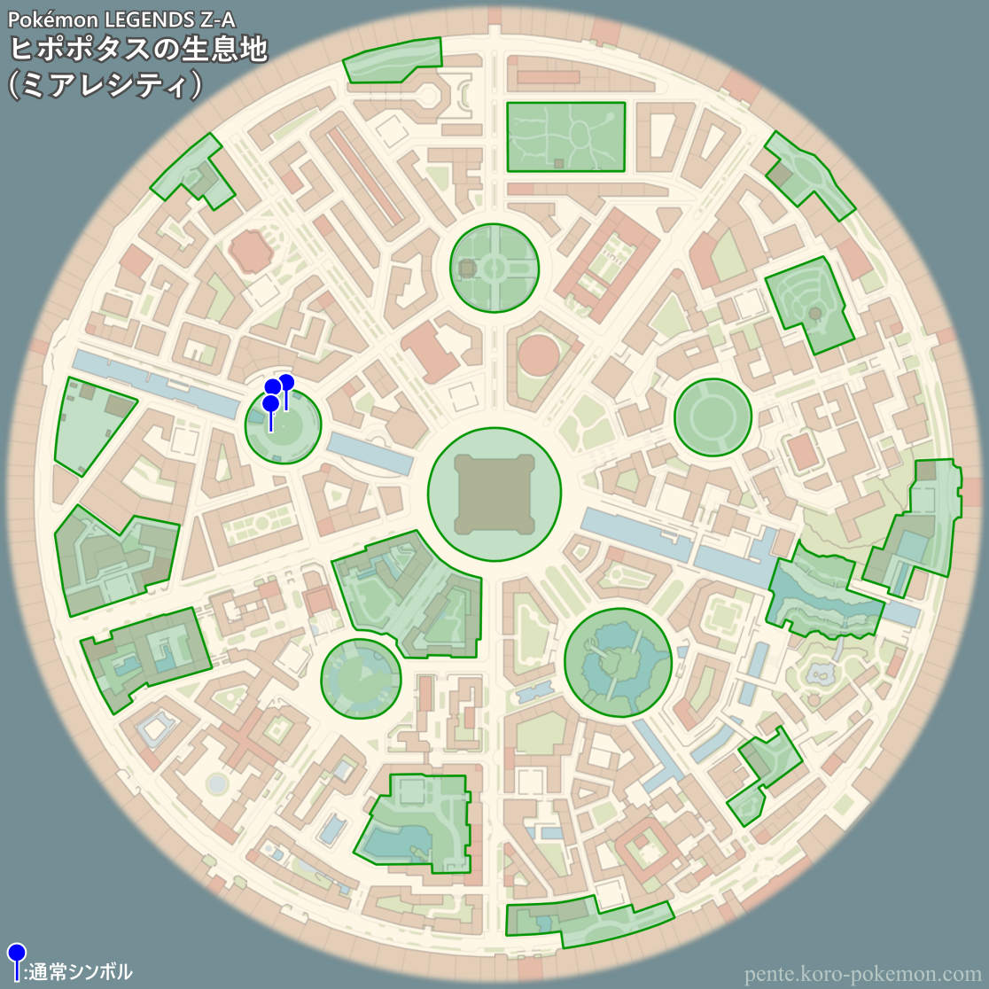 『Pokémon LEGENDS Z-A』(ポケモンレジェンズZ-A/ポケモンZA) の冒険の舞台ミアレシティにおけるヒポポタスの生息地/分布図。