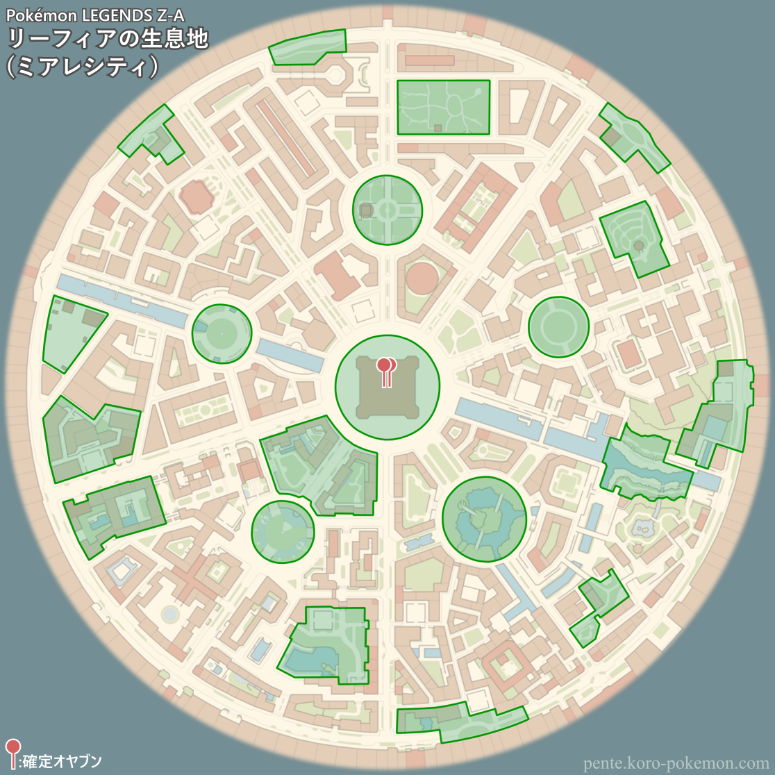 『Pokémon LEGENDS Z-A』(ポケモンレジェンズZ-A/ポケモンZA) の冒険の舞台ミアレシティにおけるリーフィアの生息地/分布図。