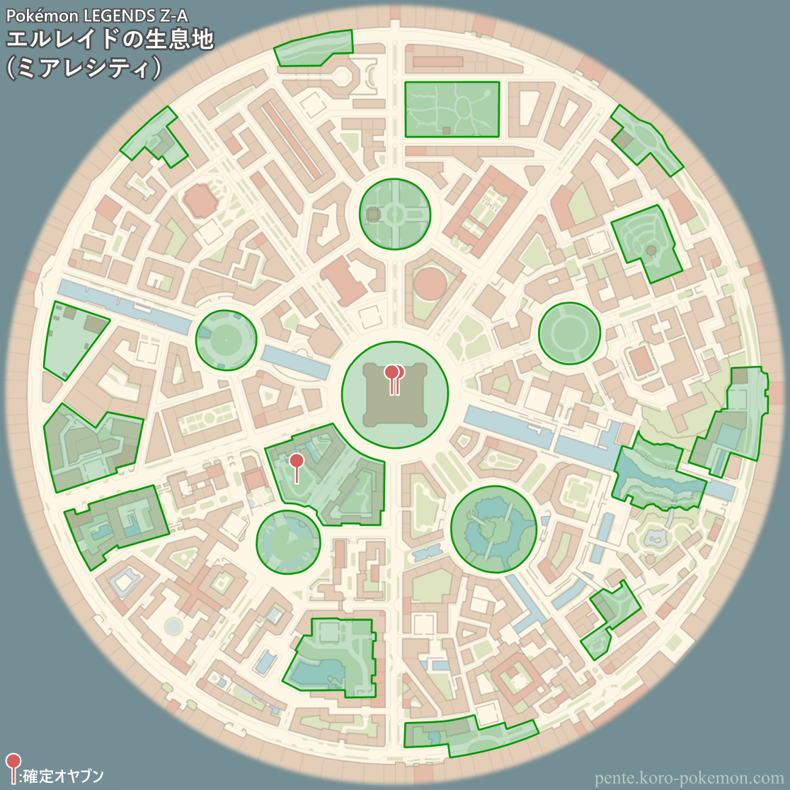 『Pokémon LEGENDS Z-A』(ポケモンレジェンズZ-A/ポケモンZA) の冒険の舞台ミアレシティにおけるエルレイドの生息地/分布図。