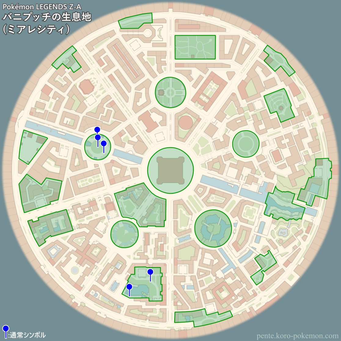『Pokémon LEGENDS Z-A』(ポケモンレジェンズZ-A/ポケモンZA) の冒険の舞台ミアレシティにおけるバニプッチの生息地/分布図。
