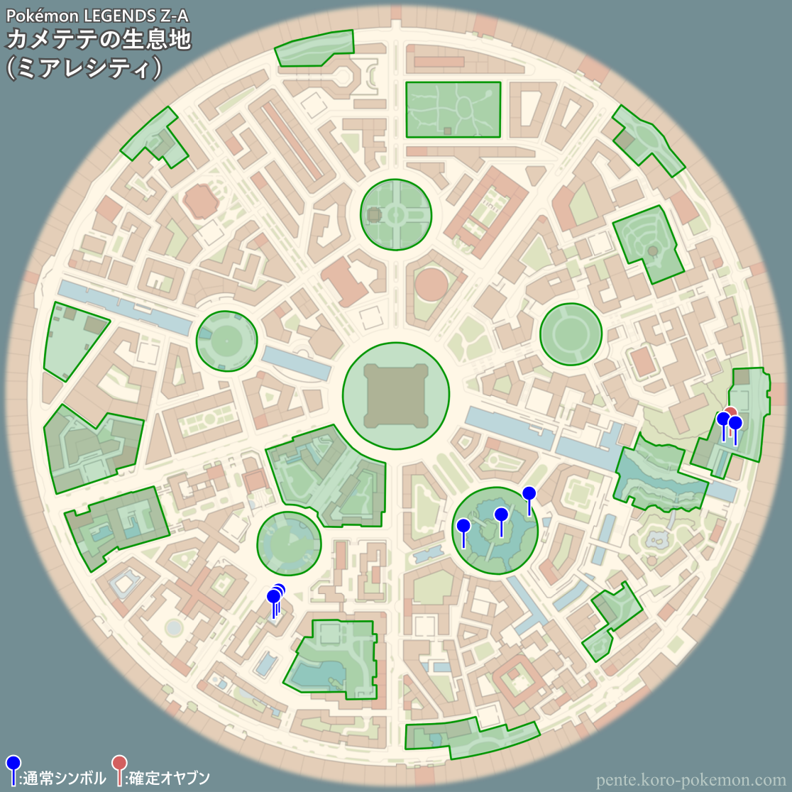『Pokémon LEGENDS Z-A』(ポケモンレジェンズZ-A/ポケモンZA) の冒険の舞台ミアレシティにおけるカメテテの生息地/分布図。