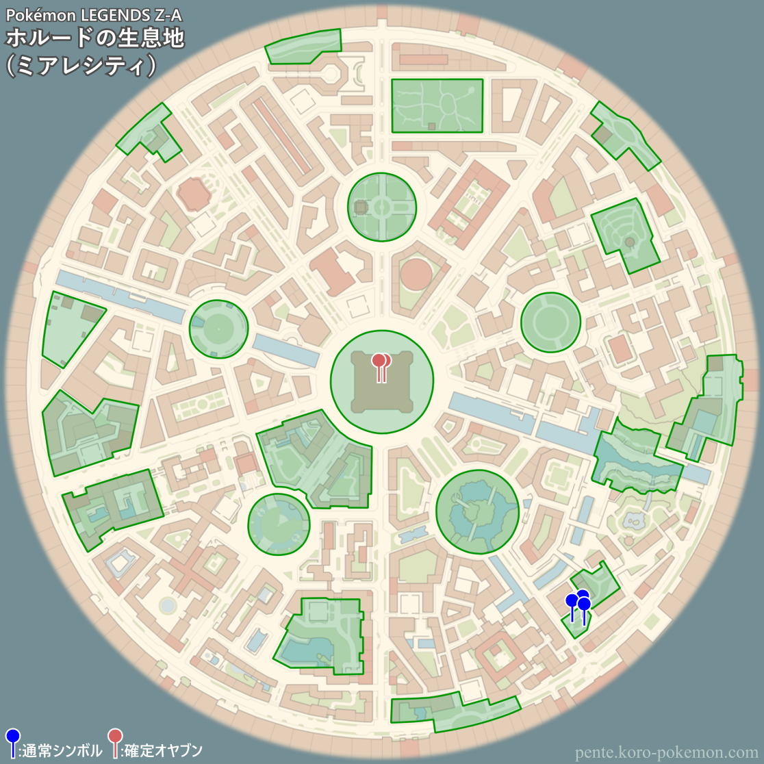 『Pokémon LEGENDS Z-A』(ポケモンレジェンズZ-A/ポケモンZA) の冒険の舞台ミアレシティにおけるホルードの生息地/分布図。