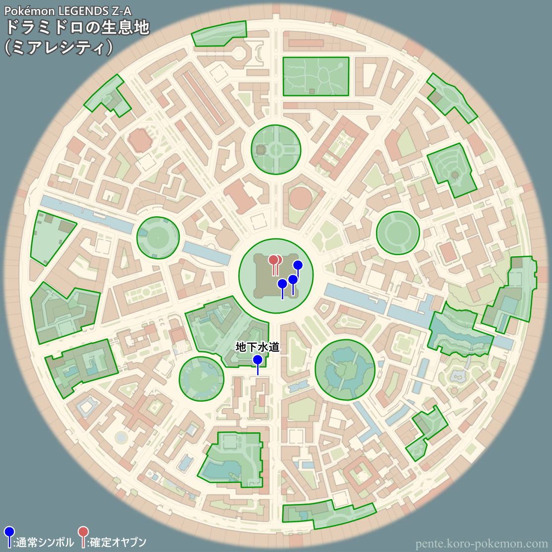 『Pokémon LEGENDS Z-A』(ポケモンレジェンズZ-A/ポケモンZA) の冒険の舞台ミアレシティにおけるドラミドロの生息地/分布図。