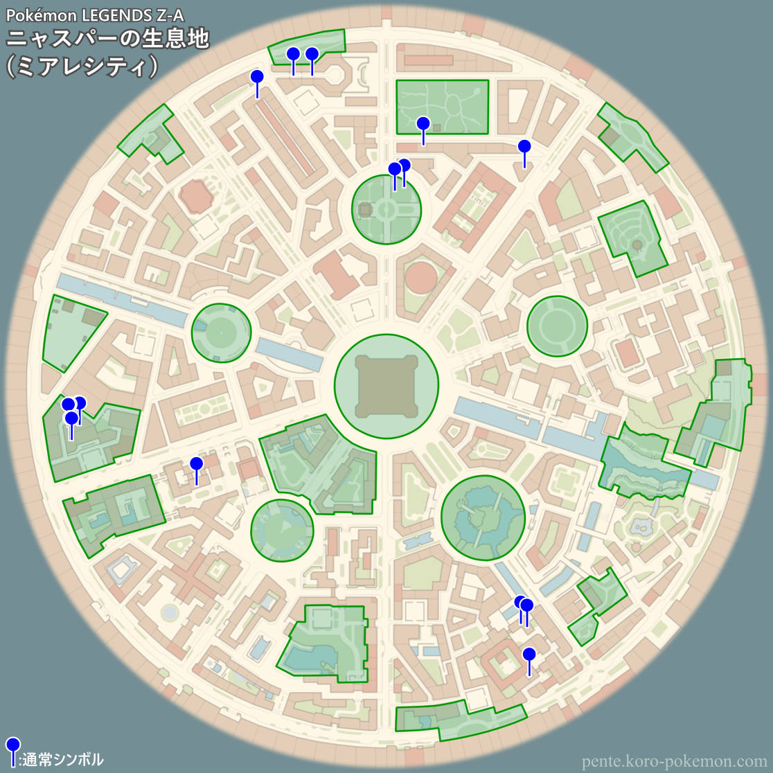 『Pokémon LEGENDS Z-A』(ポケモンレジェンズZ-A/ポケモンZA) の冒険の舞台ミアレシティにおけるニャスパーの生息地/分布図。
