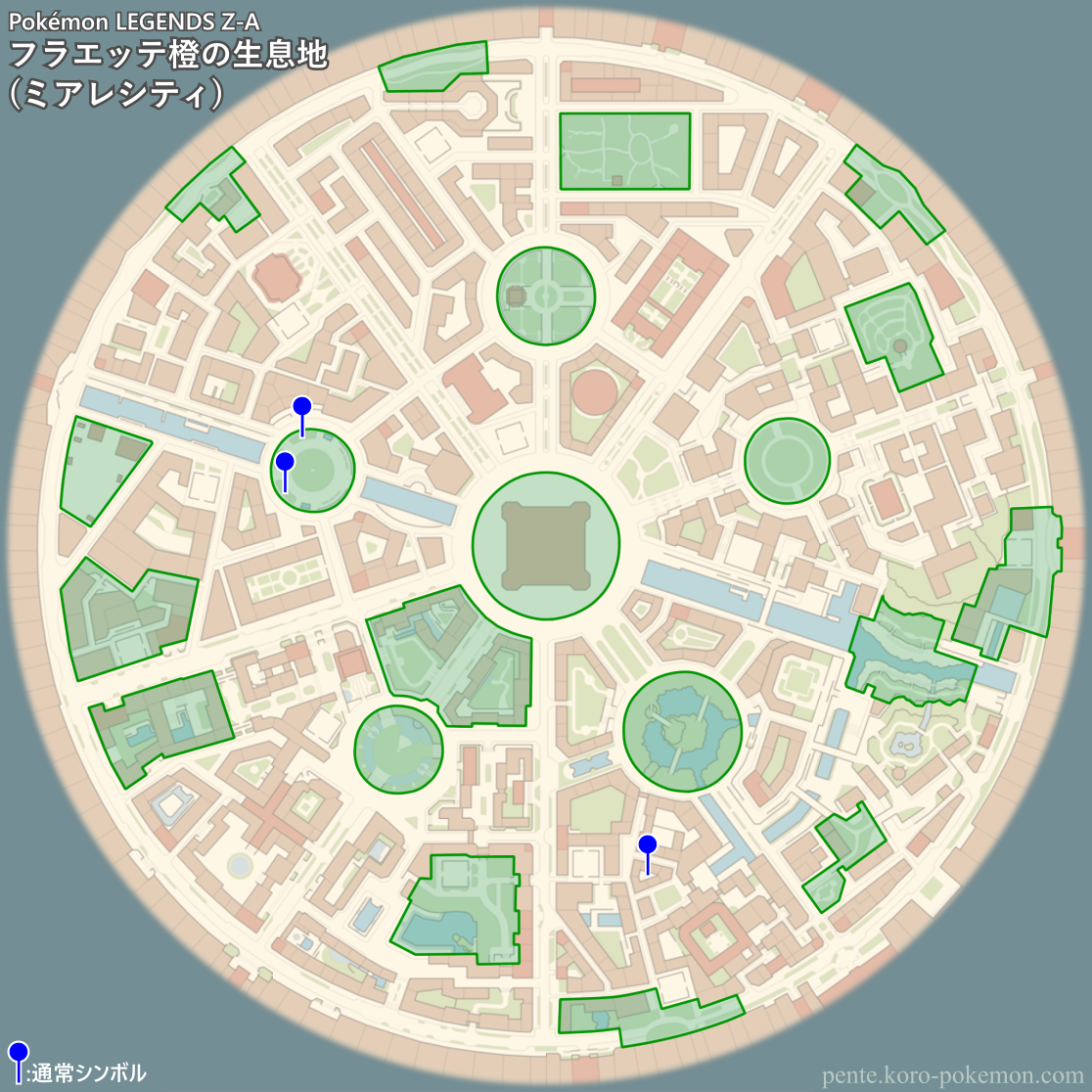 『Pokémon LEGENDS Z-A』(ポケモンレジェンズZ-A/ポケモンZA) の冒険の舞台ミアレシティにおけるフラエッテ (オレンジいろのはな) の生息地/分布図。
