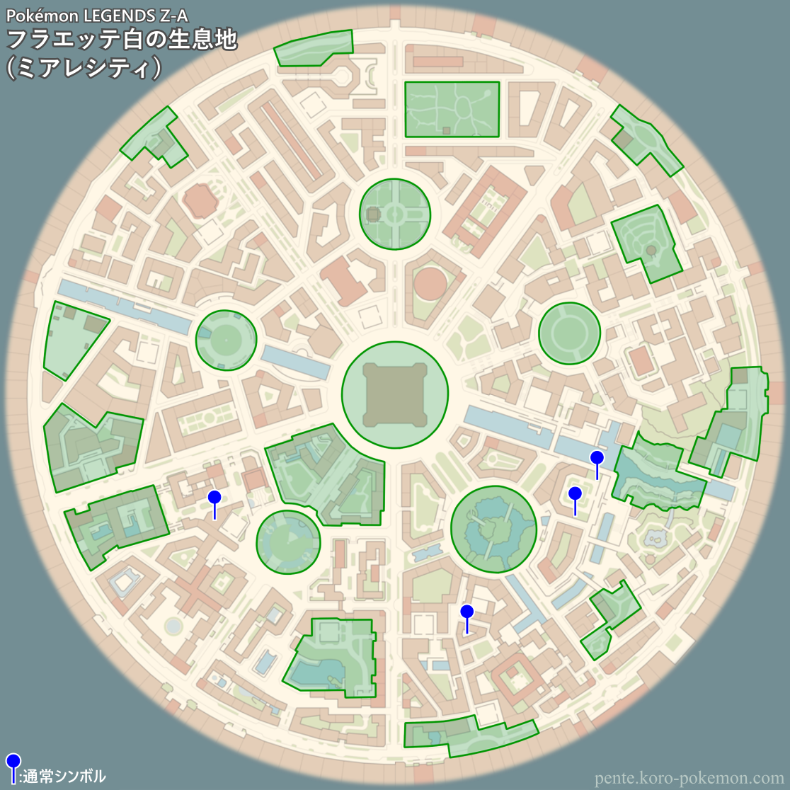 『Pokémon LEGENDS Z-A』(ポケモンレジェンズZ-A/ポケモンZA) の冒険の舞台ミアレシティにおけるフラエッテ (しろいはな) の生息地/分布図。