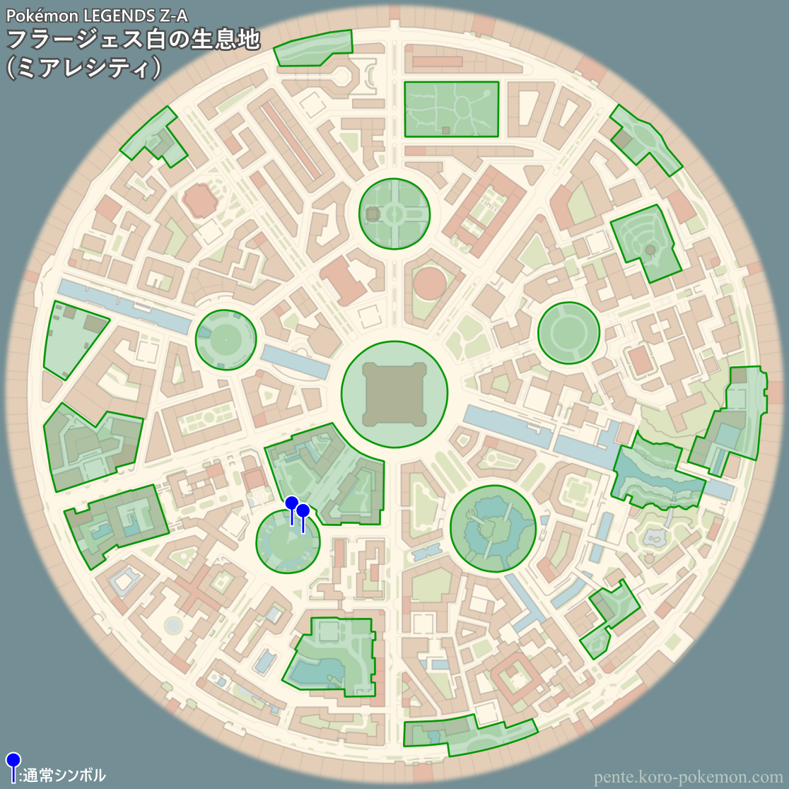 『Pokémon LEGENDS Z-A』(ポケモンレジェンズZ-A/ポケモンZA) の冒険の舞台ミアレシティにおけるフラージェス (しろいはな) の生息地/分布図。