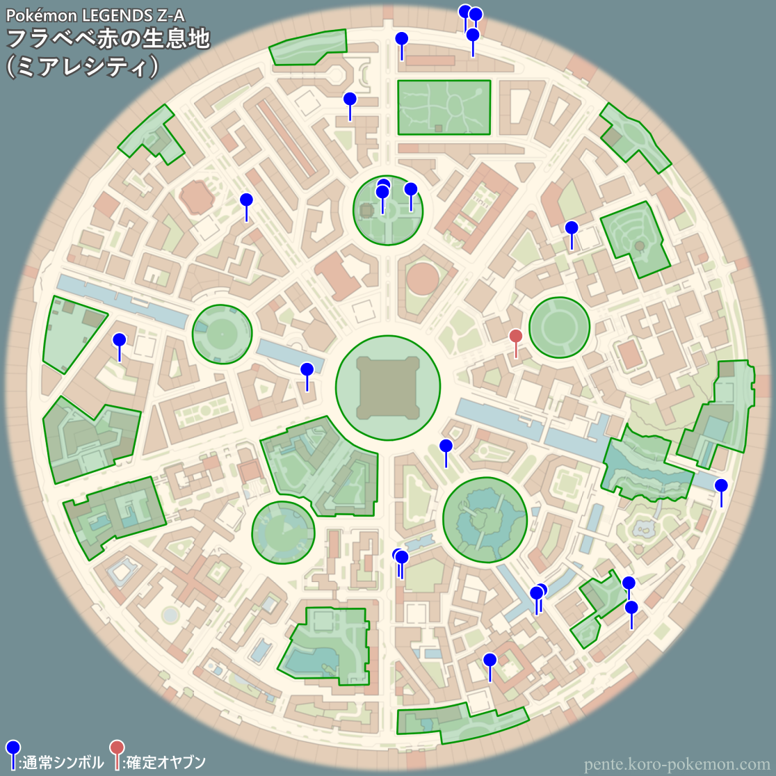 『Pokémon LEGENDS Z-A』(ポケモンレジェンズZ-A/ポケモンZA) の冒険の舞台ミアレシティにおけるフラベベ (あかいはな) の生息地/分布図。