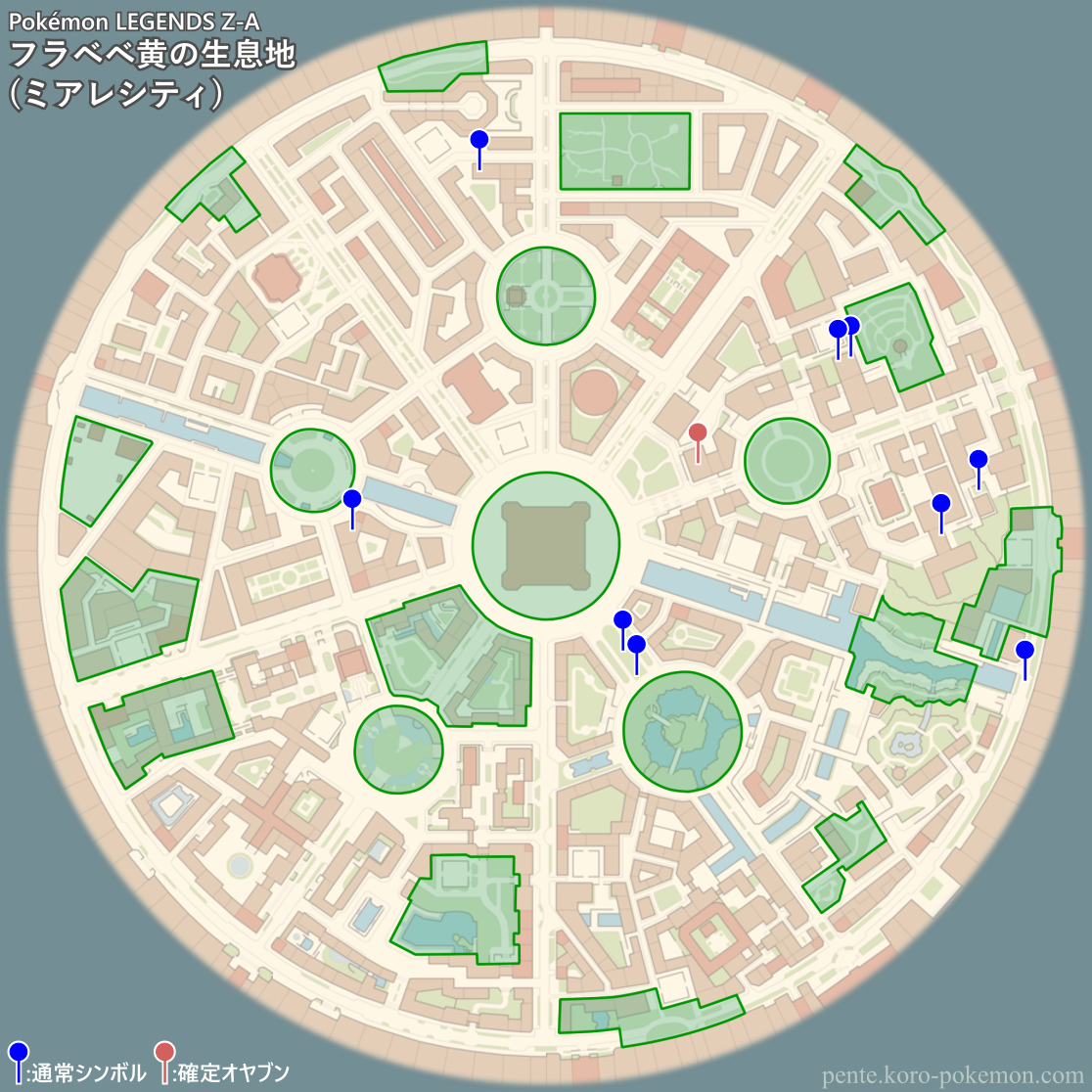 『Pokémon LEGENDS Z-A』(ポケモンレジェンズZ-A/ポケモンZA) の冒険の舞台ミアレシティにおけるフラベベ (きいろのはな) の生息地/分布図。
