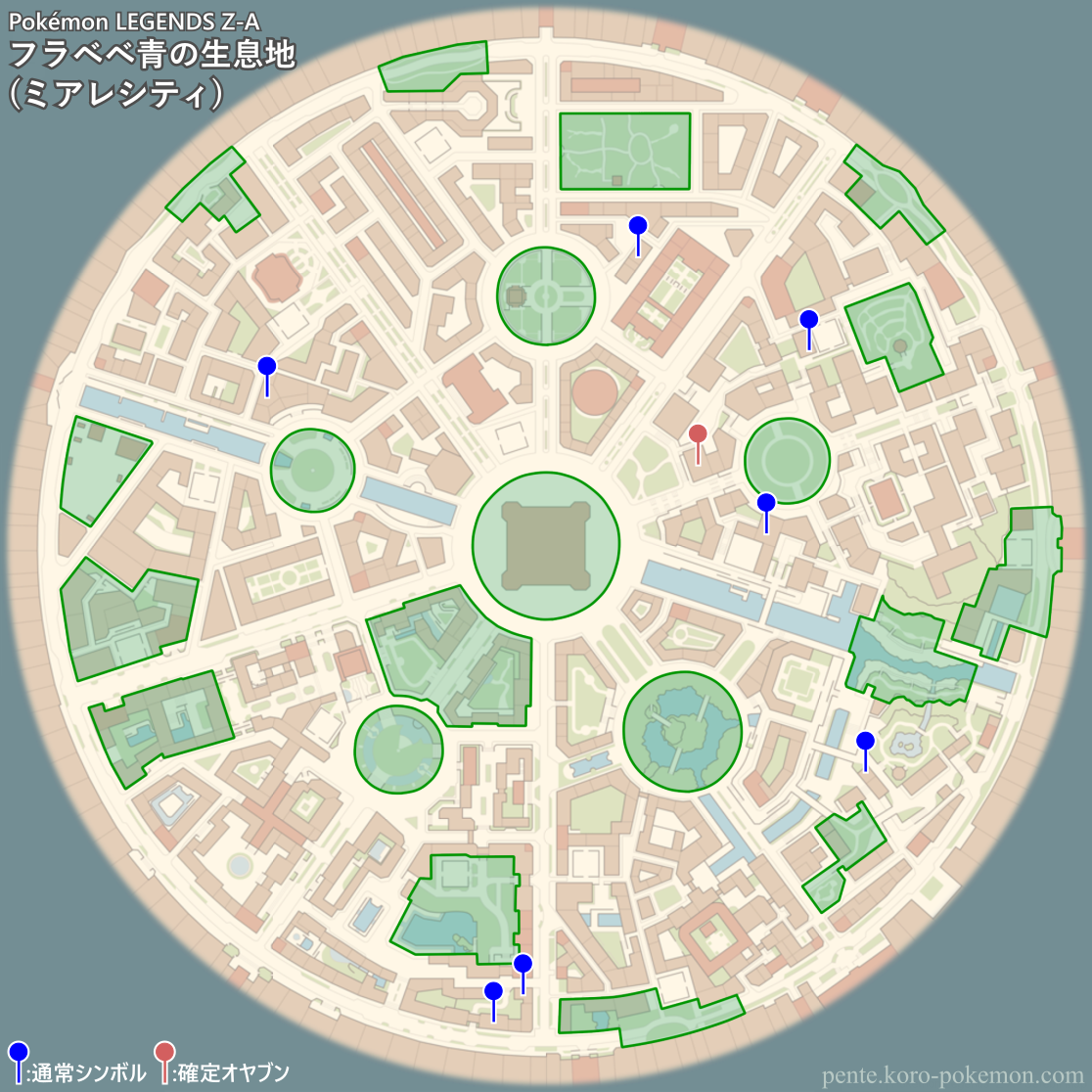 『Pokémon LEGENDS Z-A』(ポケモンレジェンズZ-A/ポケモンZA) の冒険の舞台ミアレシティにおけるフラベベ (あおいはな) の生息地/分布図。