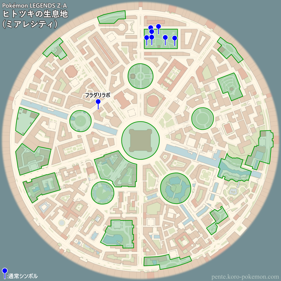 『Pokémon LEGENDS Z-A』(ポケモンレジェンズZ-A/ポケモンZA) の冒険の舞台ミアレシティにおけるヒトツキの生息地/分布図。