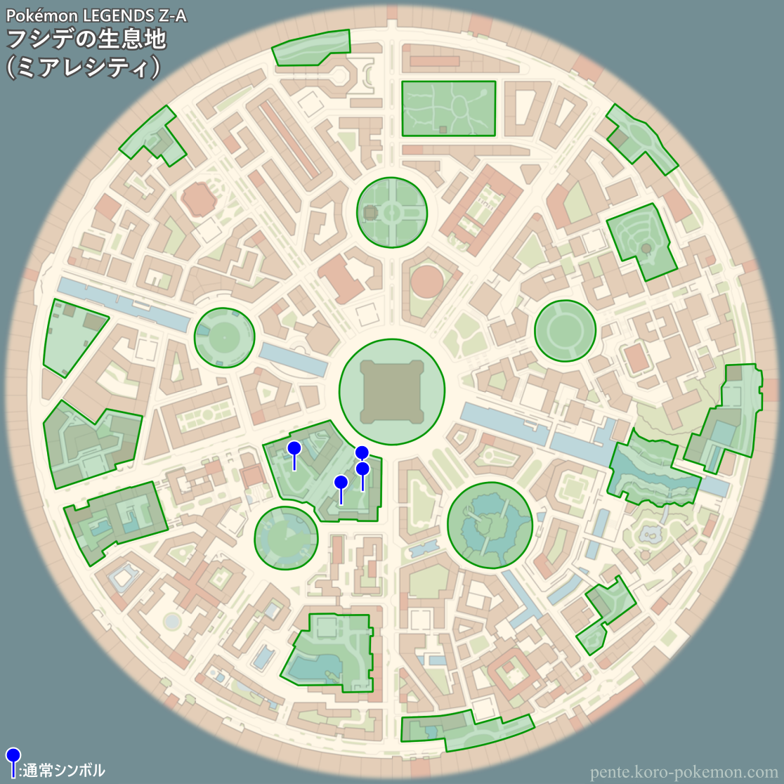 『Pokémon LEGENDS Z-A』(ポケモンレジェンズZ-A/ポケモンZA) の冒険の舞台ミアレシティにおけるフシデの生息地/分布図。