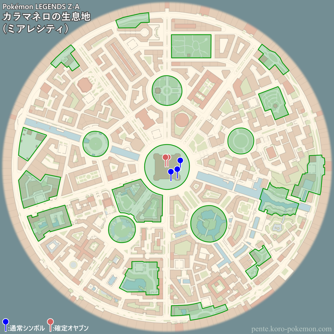 『Pokémon LEGENDS Z-A』(ポケモンレジェンズZ-A/ポケモンZA) の冒険の舞台ミアレシティにおけるカラマネロの生息地/分布図。
