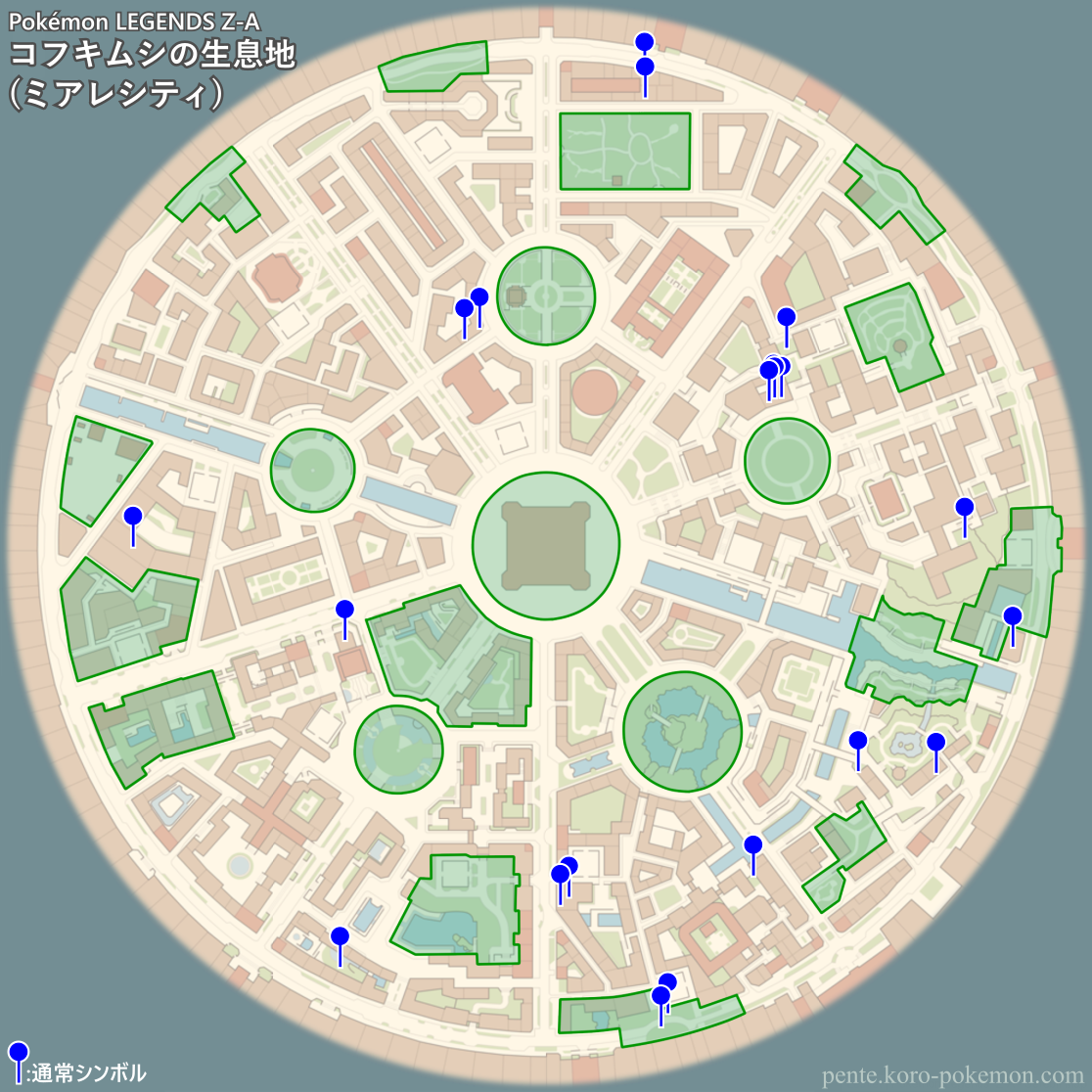 『Pokémon LEGENDS Z-A』(ポケモンレジェンズZ-A/ポケモンZA) の冒険の舞台ミアレシティにおけるコフキムシの生息地/分布図。
