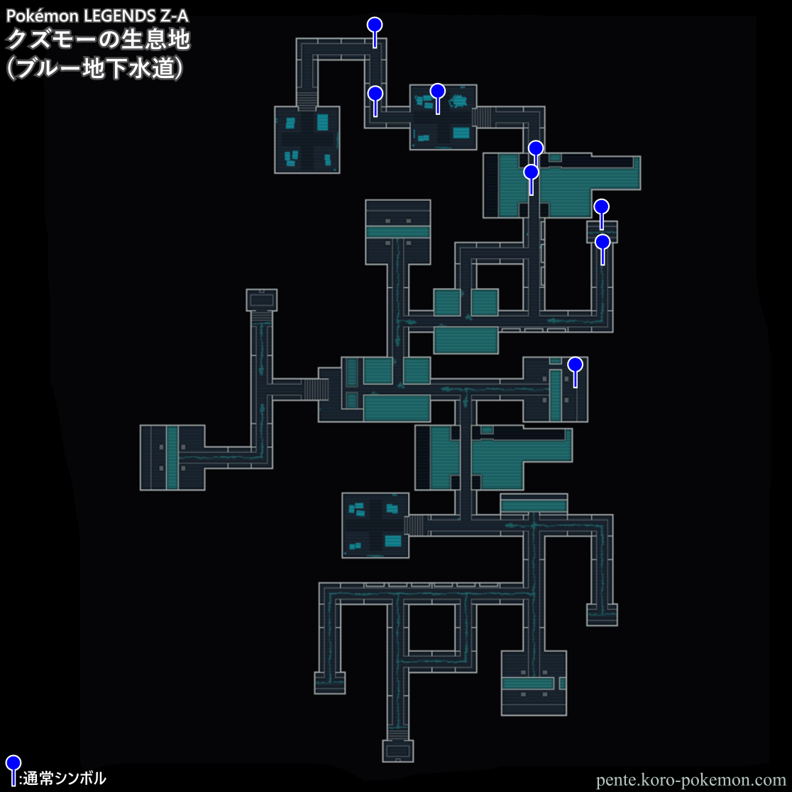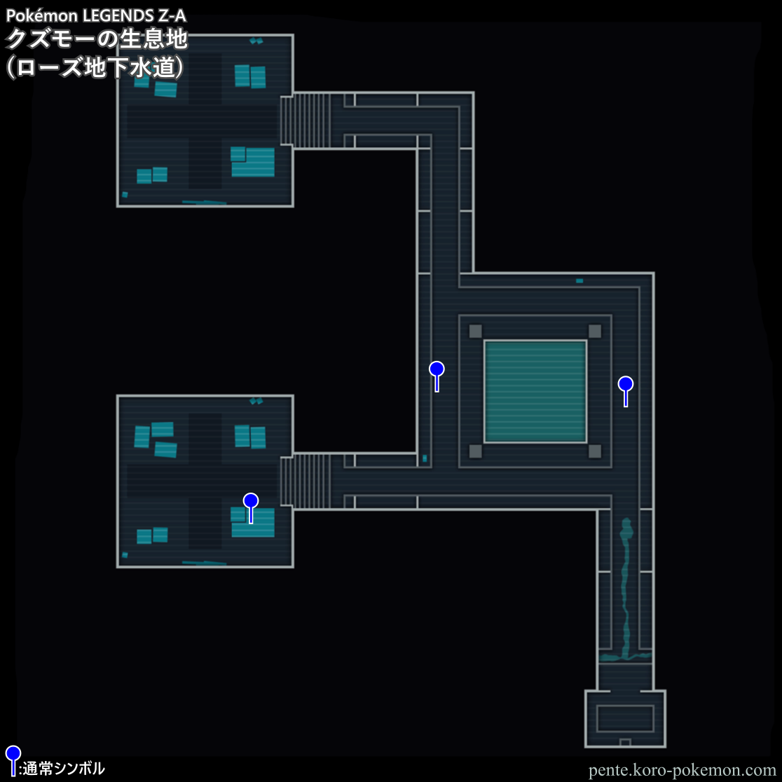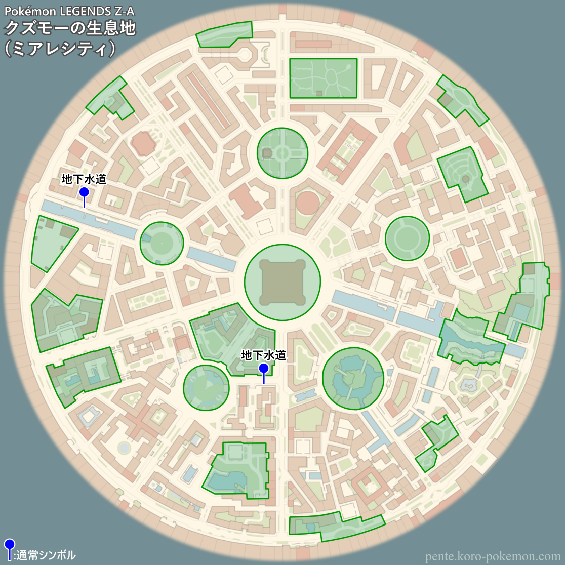 『Pokémon LEGENDS Z-A』(ポケモンレジェンズZ-A/ポケモンZA) の冒険の舞台ミアレシティにおけるクズモーの生息地/分布図。