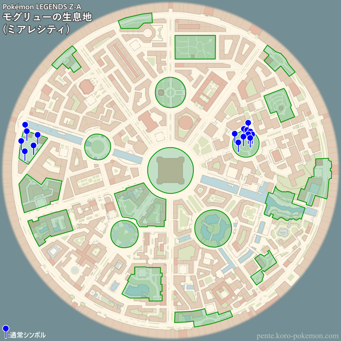 『Pokémon LEGENDS Z-A』(ポケモンレジェンズZ-A/ポケモンZA) の冒険の舞台ミアレシティにおけるモグリューの生息地/分布図。