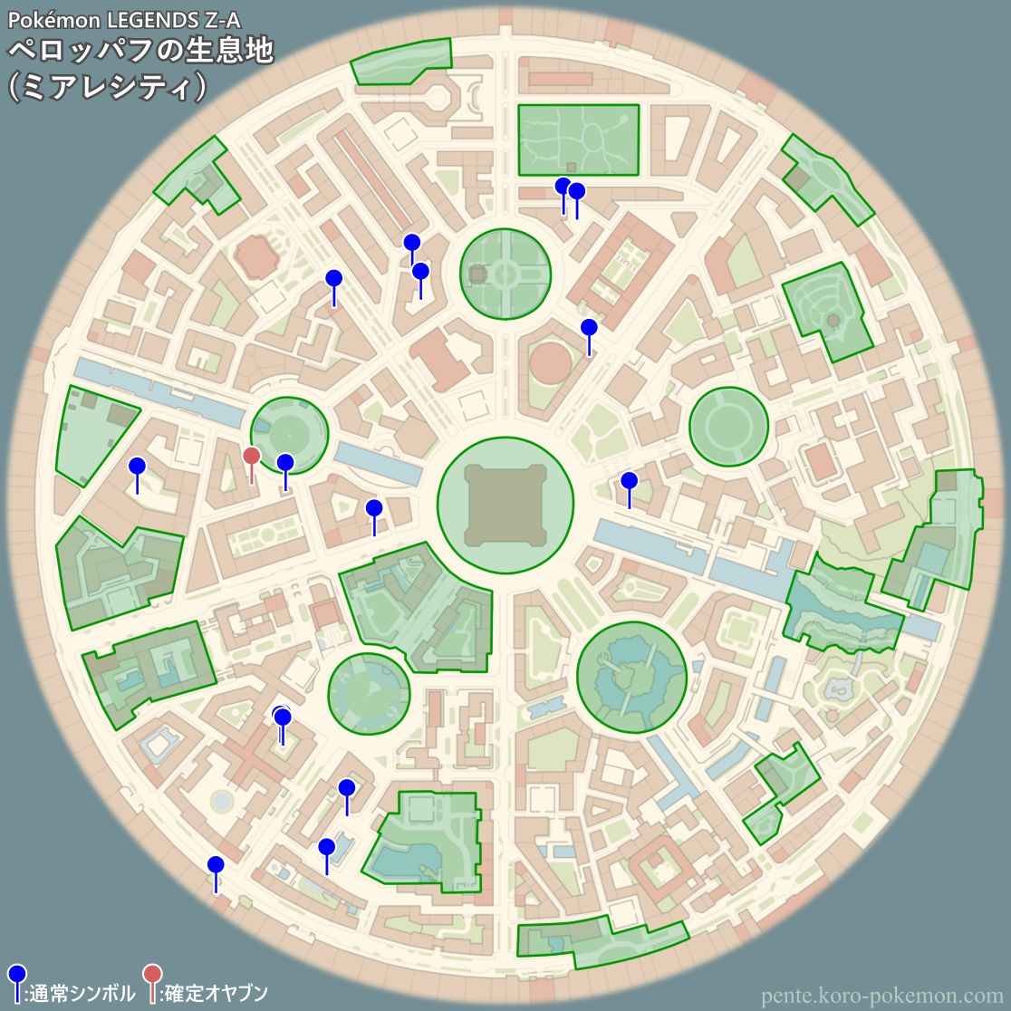 『Pokémon LEGENDS Z-A』(ポケモンレジェンズZ-A/ポケモンZA) の冒険の舞台ミアレシティにおけるペロッパフの生息地/分布図。