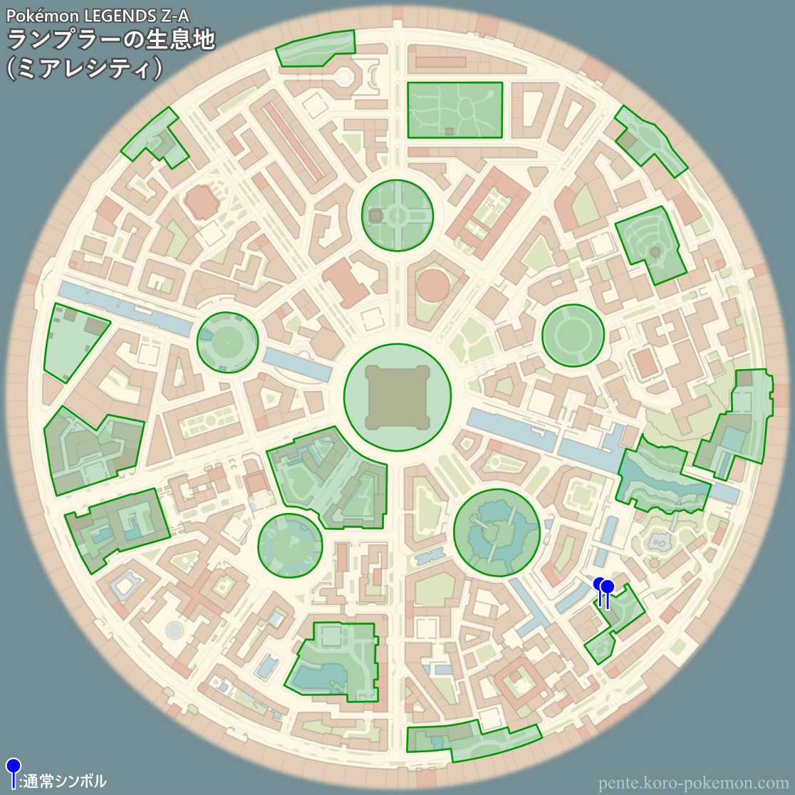 『Pokémon LEGENDS Z-A』(ポケモンレジェンズZ-A/ポケモンZA) の冒険の舞台ミアレシティにおけるランプラーの生息地/分布図。
