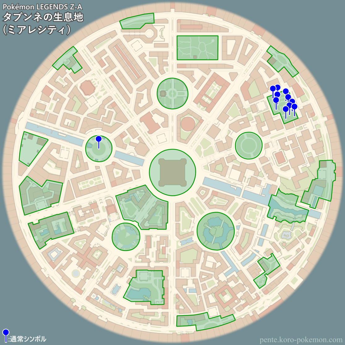 『Pokémon LEGENDS Z-A』(ポケモンレジェンズZ-A/ポケモンZA) の冒険の舞台ミアレシティにおけるタブンネの生息地/分布図。