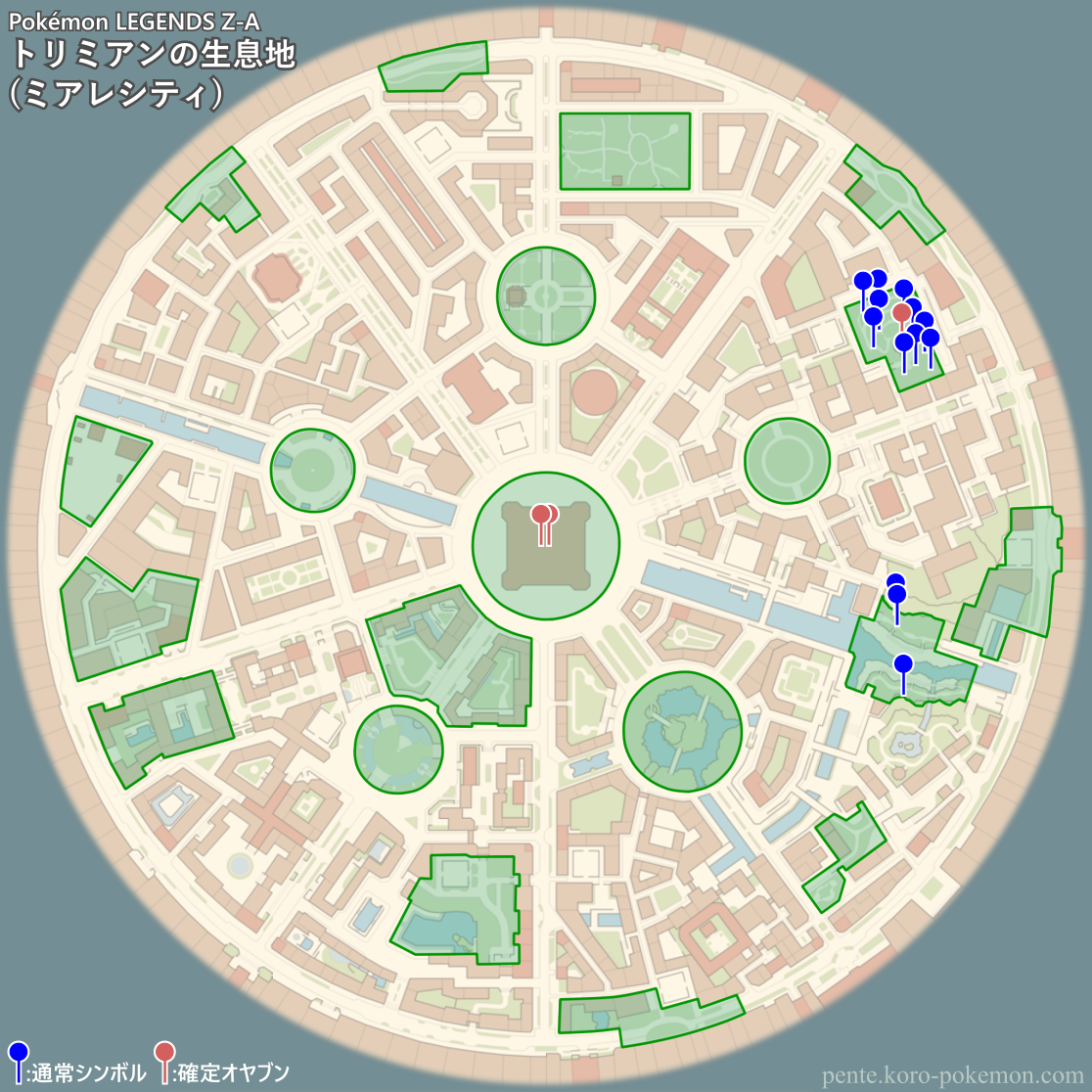『Pokémon LEGENDS Z-A』(ポケモンレジェンズZ-A/ポケモンZA) の冒険の舞台ミアレシティにおけるトリミアン (あるがまま) の生息地/分布図。