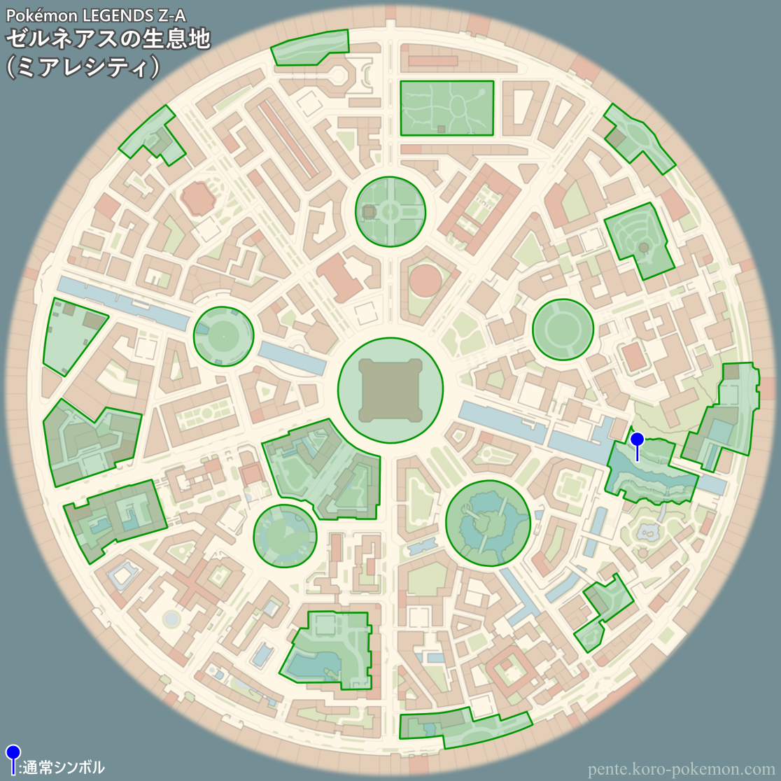 『Pokémon LEGENDS Z-A』(ポケモンレジェンズZ-A/ポケモンZA) の冒険の舞台ミアレシティにおけるゼルネアスの生息地/分布図。