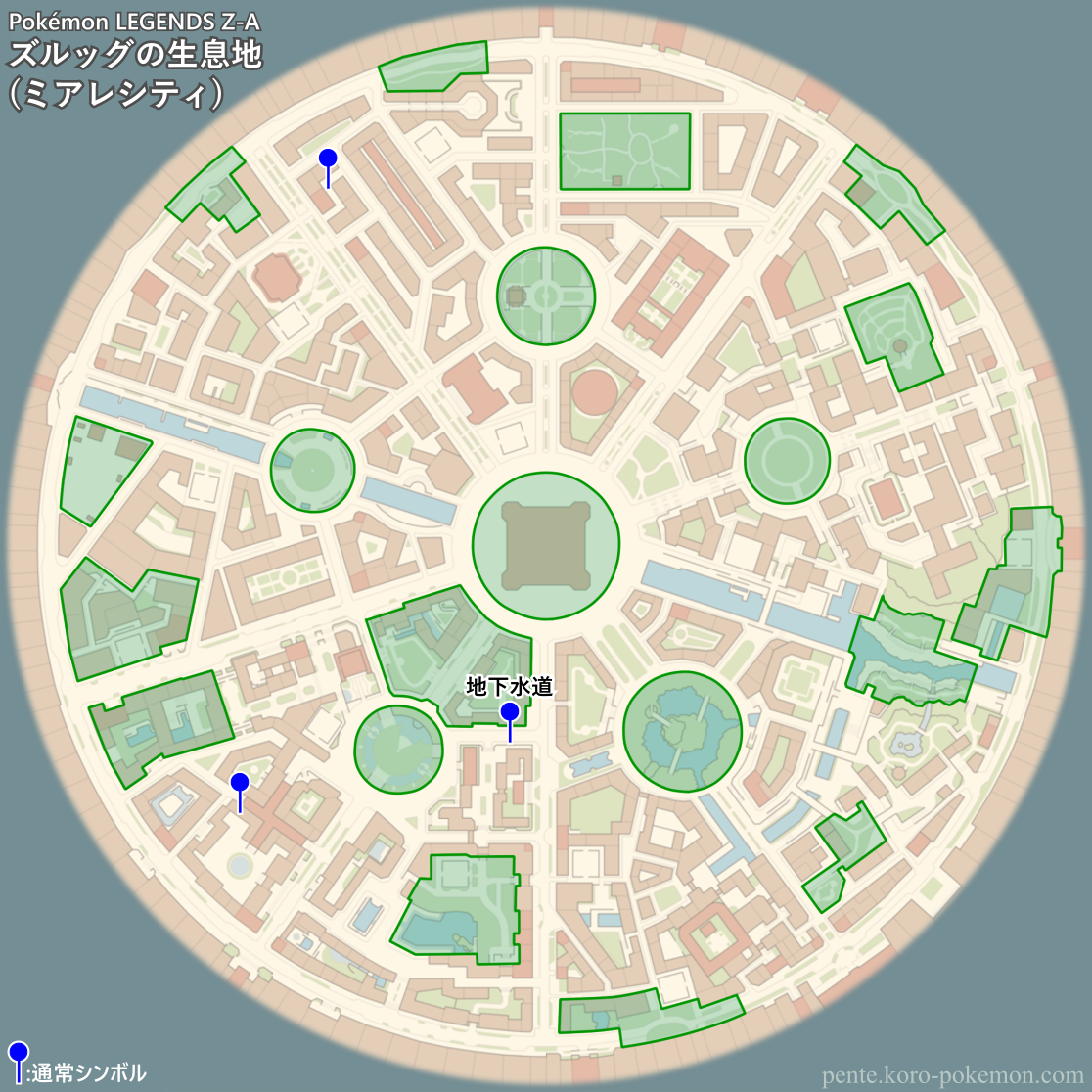 『Pokémon LEGENDS Z-A』(ポケモンレジェンズZ-A/ポケモンZA) の冒険の舞台ミアレシティにおけるズルッグの生息地/分布図。