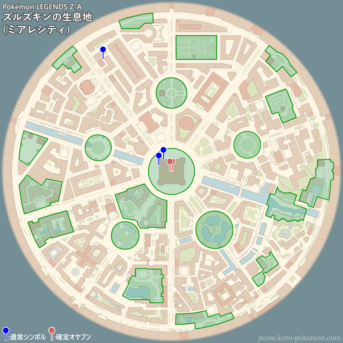『Pokémon LEGENDS Z-A』(ポケモンレジェンズZ-A/ポケモンZA) の冒険の舞台ミアレシティにおけるズルズキンの生息地/分布図。