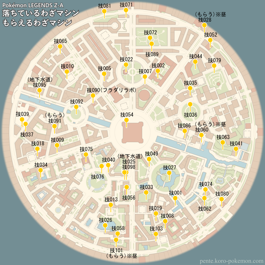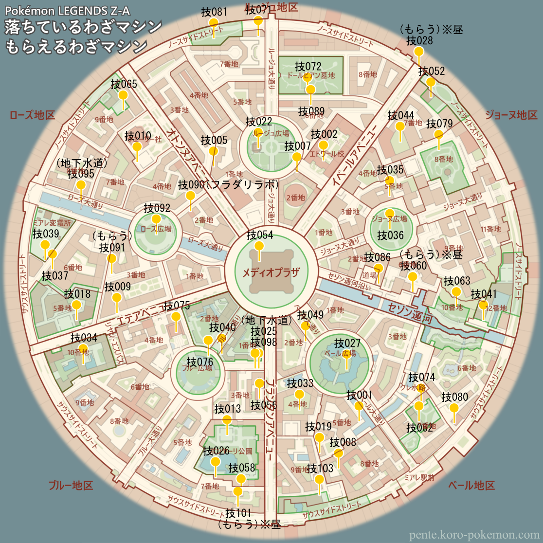 ミアレシティに落ちているわざマシンと、人からもらえるわざマシン (シナリオで必ずもらえるものを除く) の位置マップ。
